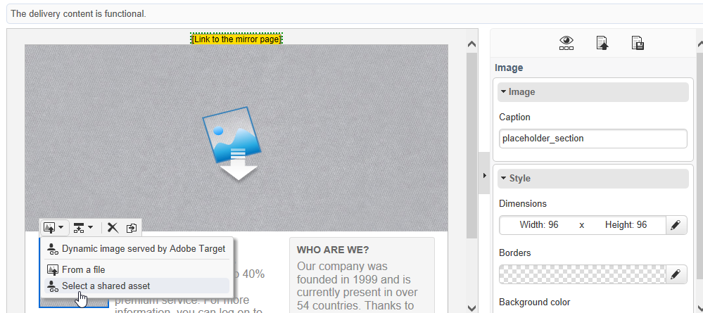 Adobe Target과의 통합을 사용하는 경우 공유 이미지를 기본 이미지로 사용할 수 있습니다. 이 페이지를 참조하십시오.