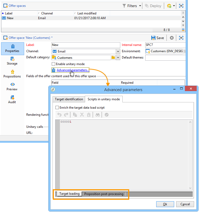 다음 Target loading 및 Proposition post-processing 후크는 Adobe Campaign에서 오퍼 공간에서 구성됩니다.