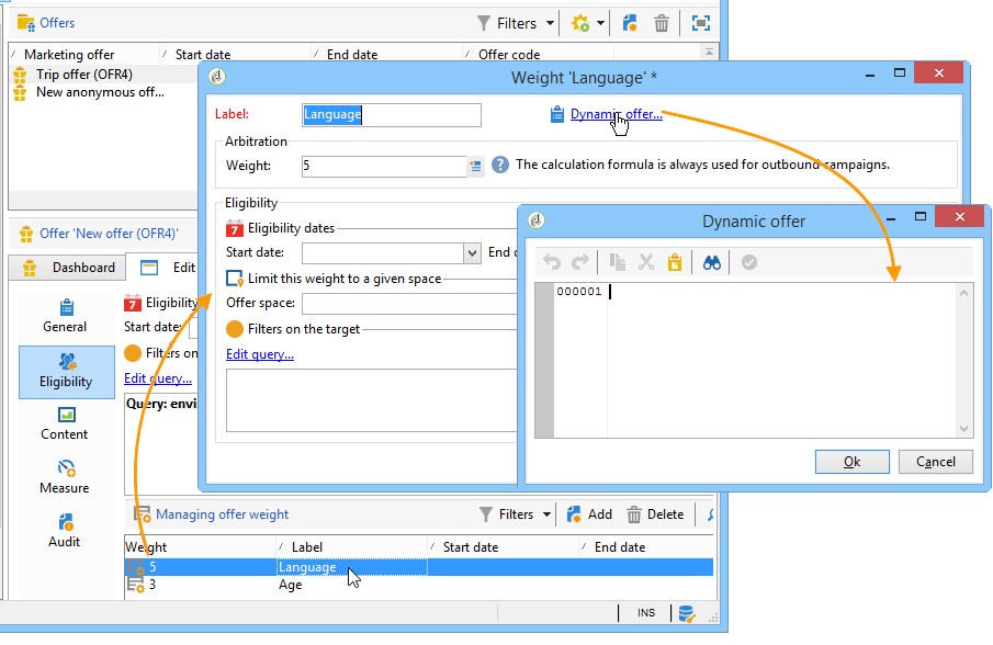 다음 Dynamic offer 후크는 Adobe Campaign의 오퍼 가중치로 구성됩니다.
