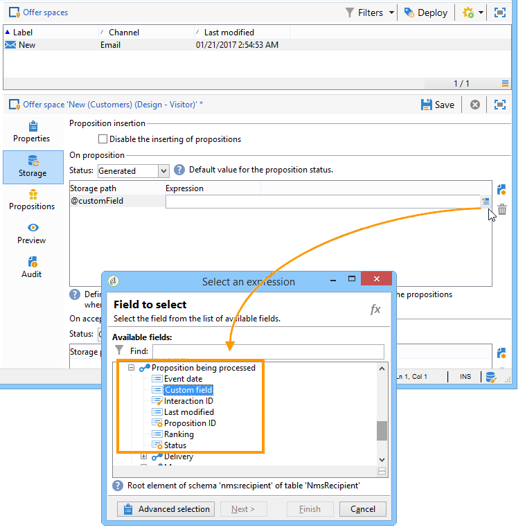 미리 통합자는 제안을 확장해야 합니다 제안 Rcp 스키마에 대한 추가 정보가 포함되어 있습니다. 이 데이터가 저장되는 위치를 지정하려면 Proposition being processed 링크는 Storage 스페이스 탭