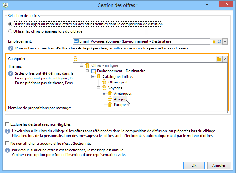 Dans votre base, vous disposez d'une catégorie d'offres de voyages à destination de l'Afrique. L'éligibilité, les contextes et les représentations de chaque offre ont été paramétrés. Vous allez à présent créer une campagne pour présenter vos offres par email.