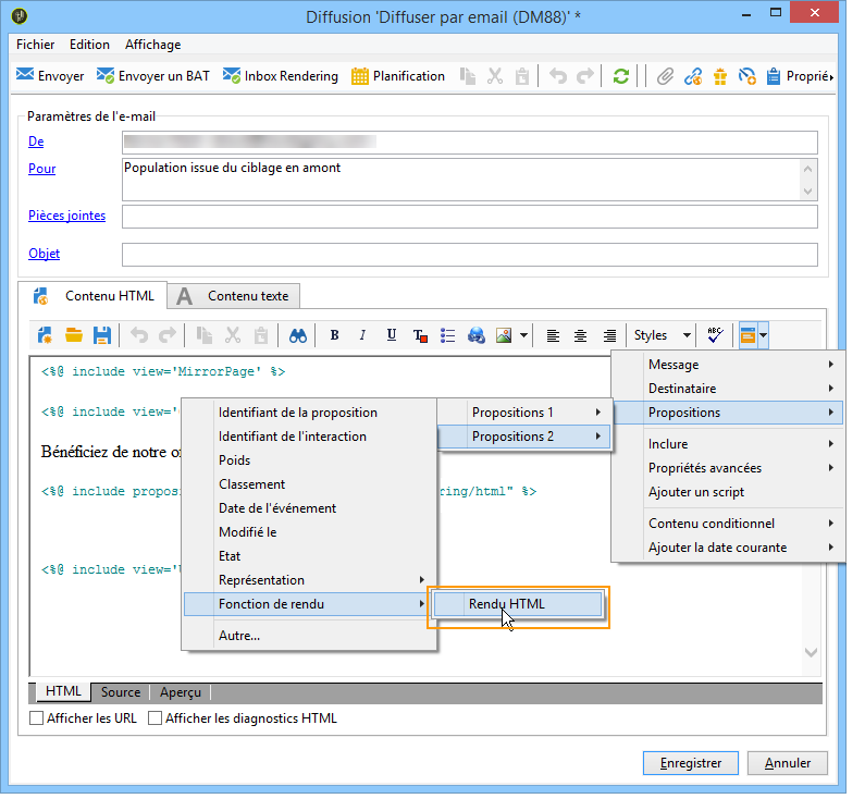 Cliquez sur le champ de fusion pour insérer une première proposition d'offre et choisissez la Fonction de rendu HTML.