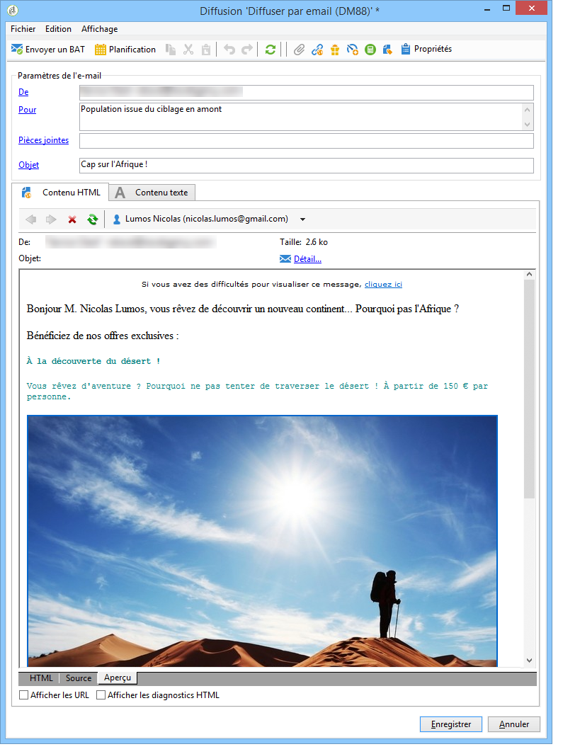 Cliquez sur Aperçu pour prévisualiser vos offres dans la diffusion puis sélectionnez un destinataire afin de visualiser les offres telles qu'il les recevra.