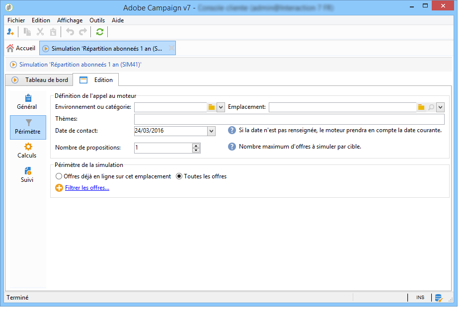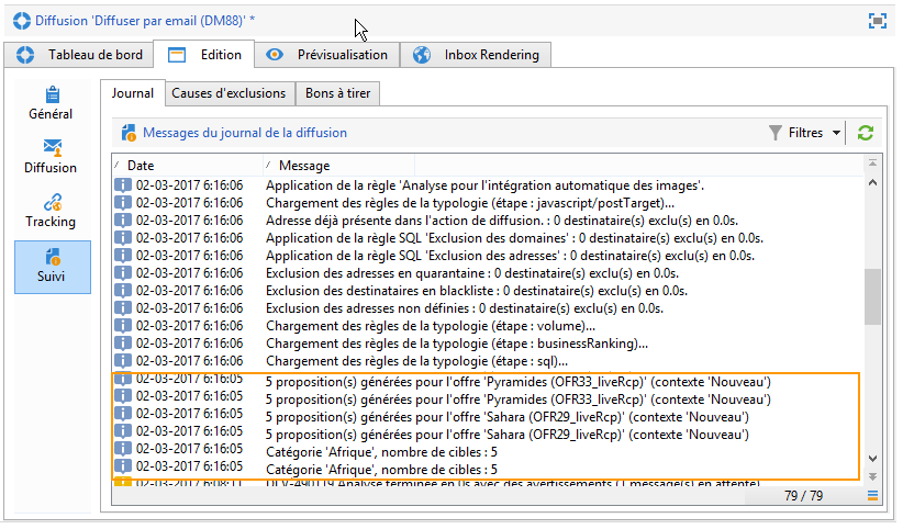Ouvrez votre diffusion et cliquez sur l'onglet Suivi : vous pouvez constater que le moteur d'offre a déterminé les propositions à faire entre les différentes offres existant dans la catégorie.