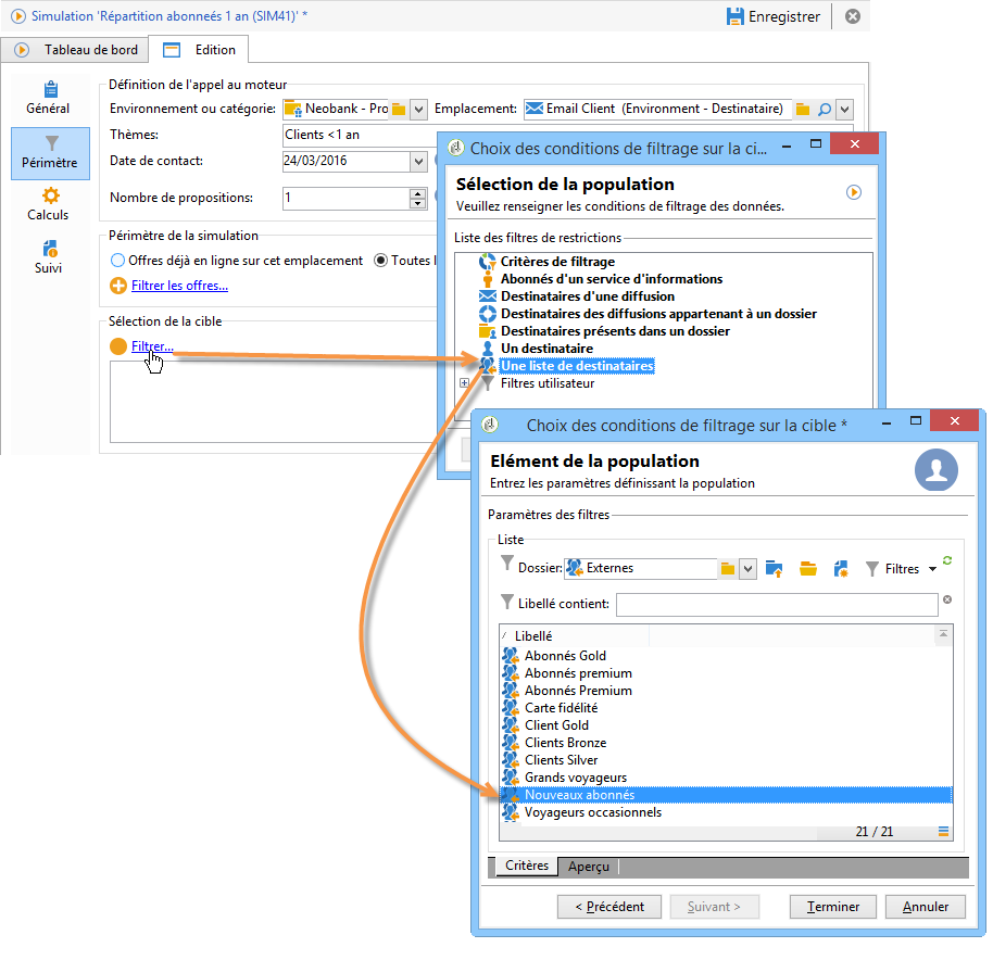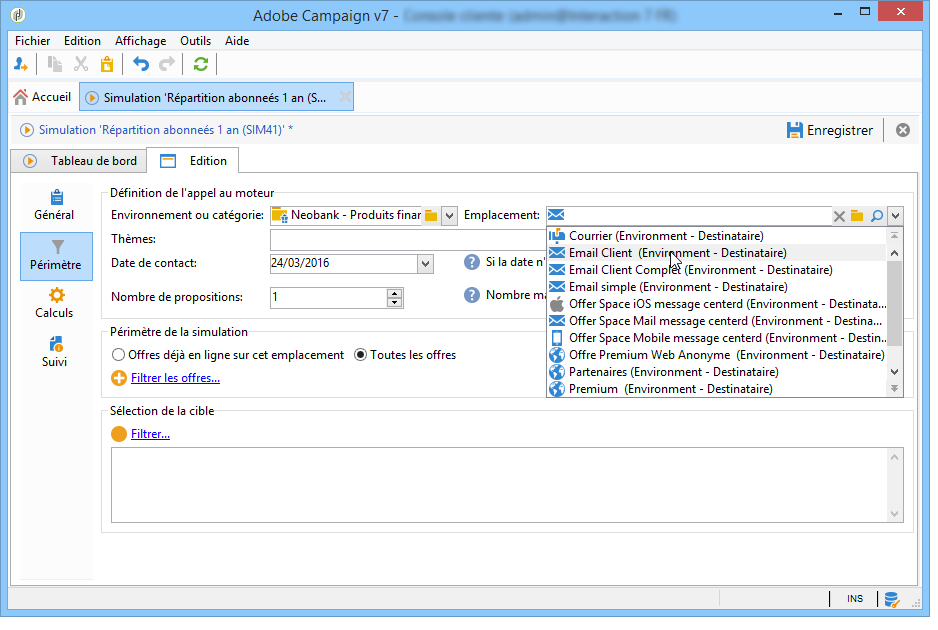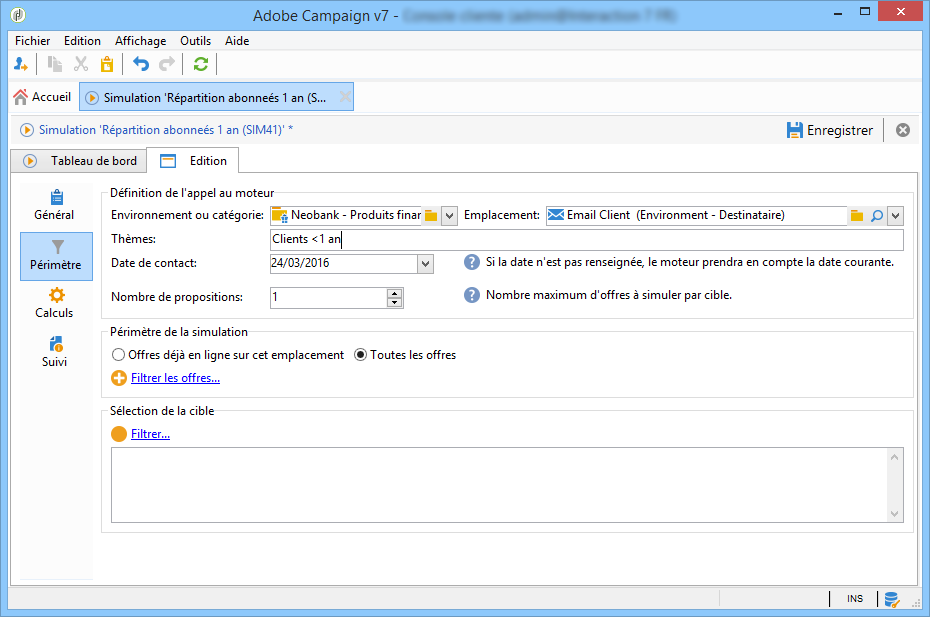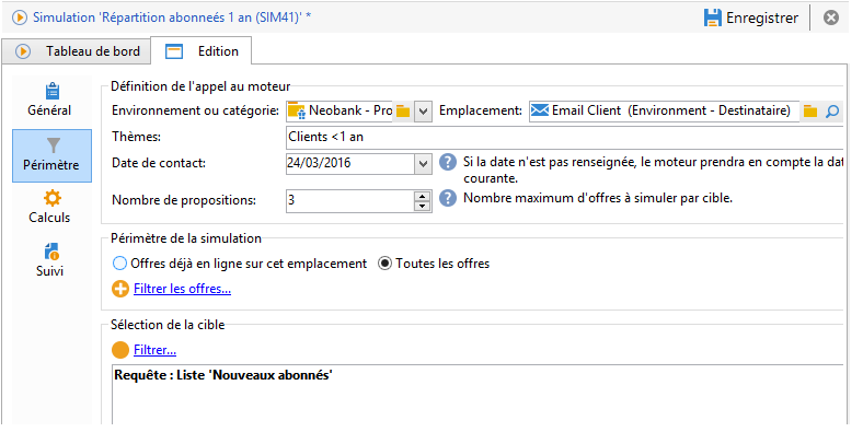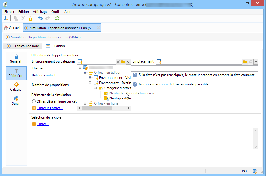 Dans notre exemple, la catégorie Produits financiers contient deux sous-catégories ayant chacune un thème distinct. La simulation portera seulement sur les offres de la catégorie dont le thème d'application est Clients < 1 an.