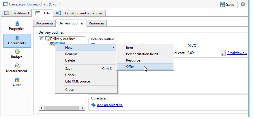 아웃라인을 추가한 다음 아웃라인을 마우스 오른쪽 단추로 클릭하고 을 선택하여 원하는 만큼 오퍼를 삽입합니다 New > Offer를 입력한 다음 캠페인을 저장합니다.
