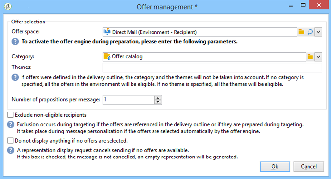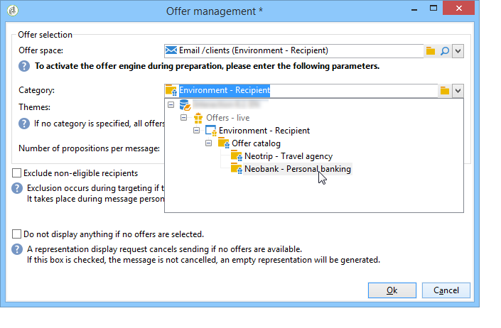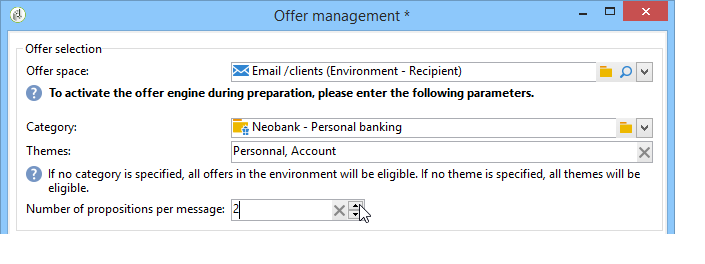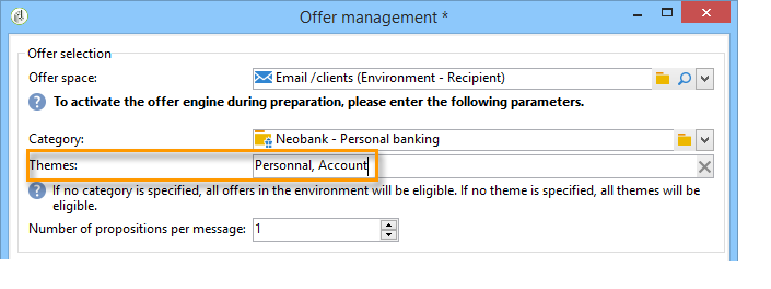 엔진의 오퍼 선택 사항을 세분화하려면 제시할 오퍼가 속하는 카테고리 또는 하나/여러 개의 테마를 선택합니다. 제한 사항을 오버로드하지 않도록 이러한 필드 중 하나만 사용하는 것이 좋습니다.