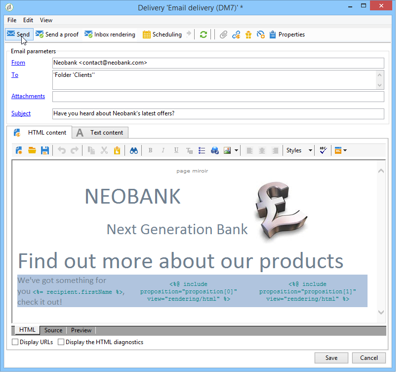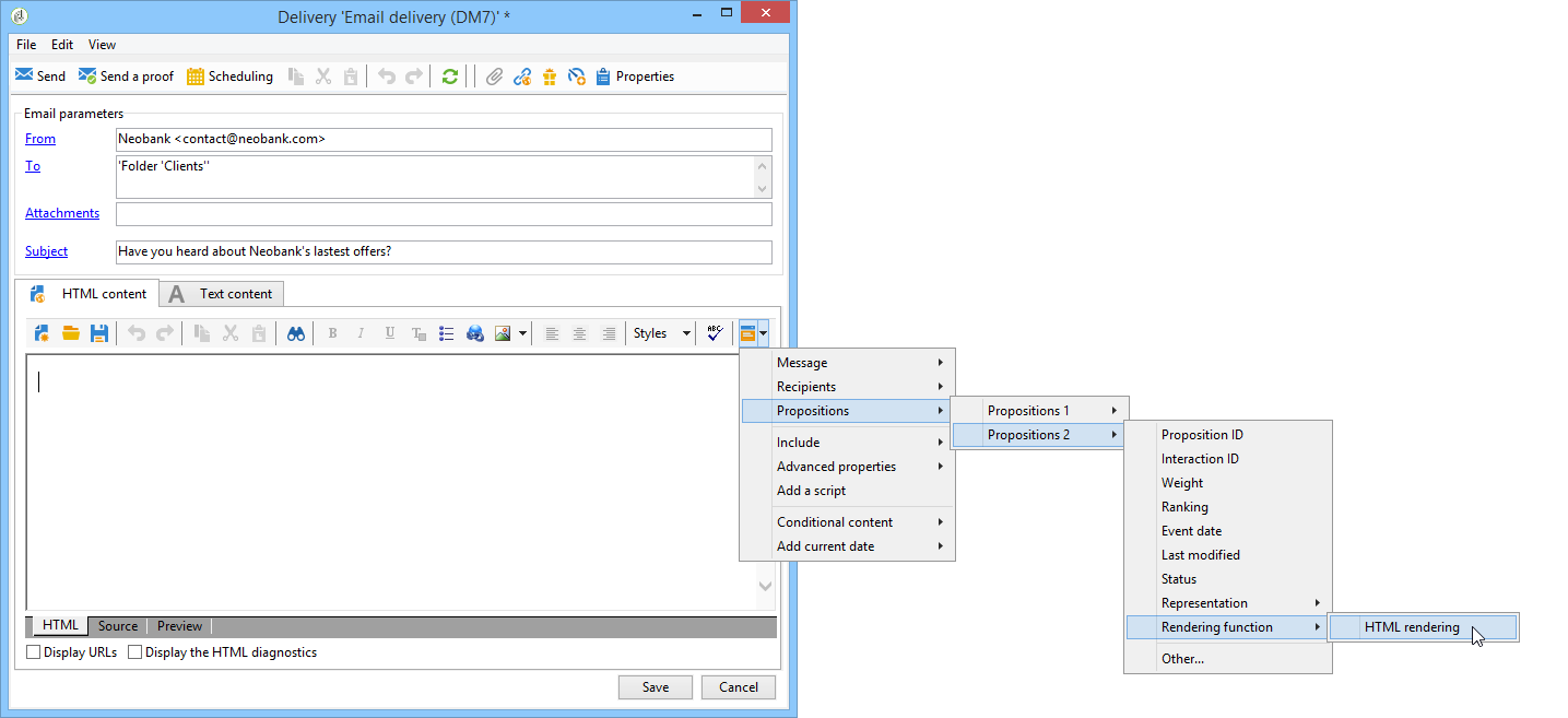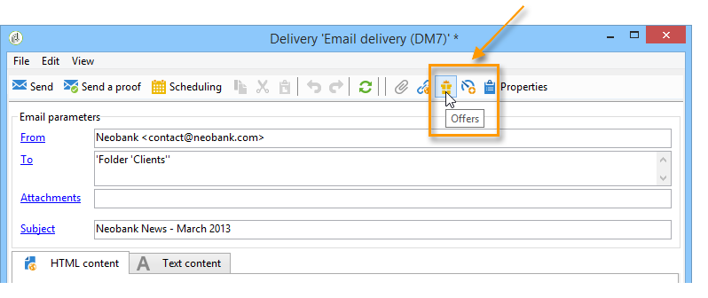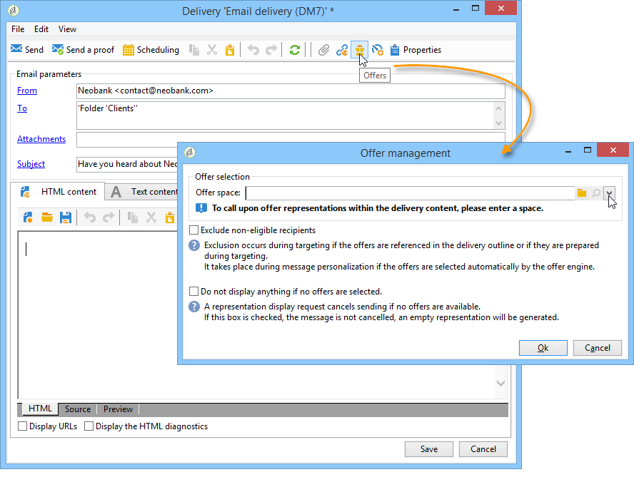 마케팅 캠페인 중에 오퍼를 제공하려면 선택한 채널을 기반으로 클래식 게재 작업을 만드십시오. 게재 컨텐츠가 정의될 때 오퍼 엔진을 Offers 아이콘 을 클릭하여 도구 모음에서 사용 가능합니다.