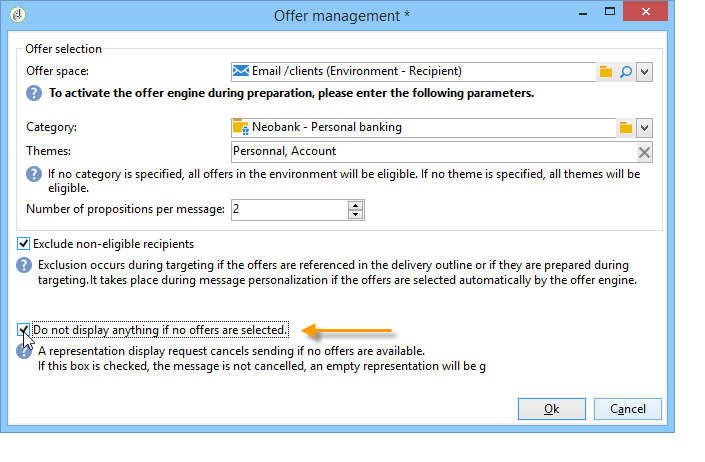 필요한 경우 Do not display anything if no offers are selected 선택 사항입니다. 자세한 내용은 오퍼 엔진 호출을 위한 매개 변수.
