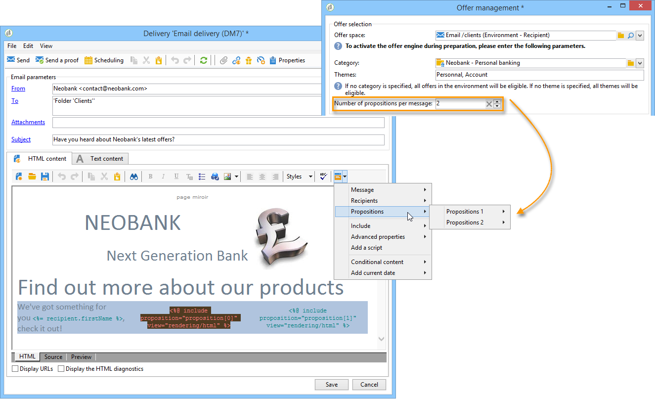 개인화 필드를 사용하여 게재 본문에 제안을 추가합니다(자세한 내용은 게재에 오퍼 제안 삽입 섹션)이나 dm 게재의 경우 추출 파일 형식을 편집하여