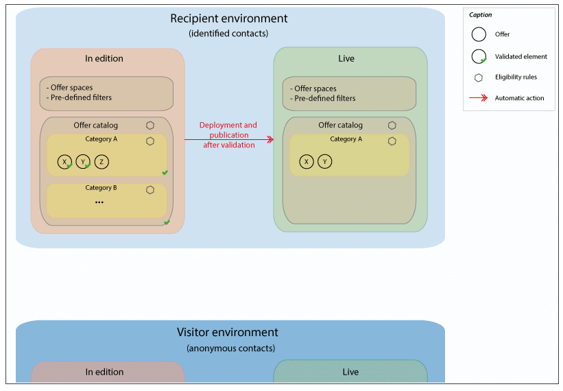디자인 환경에서 승인된 오퍼가 포함된 라이브 환경과, 디자인 환경에 구성된 다양한 오퍼 공간, 필터, 카테고리 및 규칙을 모두 찾을 수 있습니다. 오퍼 엔진에 대한 호출 동안 엔진은 항상 라이브 환경의 오퍼를 사용합니다.