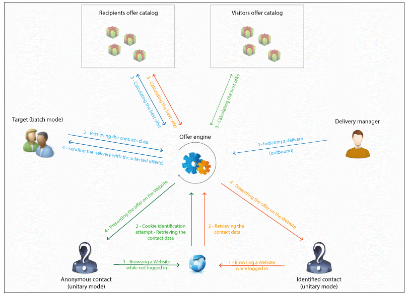 오퍼를 제공할 수 있거나 제공해야 하는 즉시(수행된 구성에 따라) 오퍼 엔진이 중간 역할을 합니다. 연락처에 대해 수신한 데이터와 애플리케이션에 지정된 대로 적용할 수 있는 다양한 규칙을 결합하여 사용할 수 있는 연락 중 가장 적합한 오퍼를 자동으로 계산합니다.