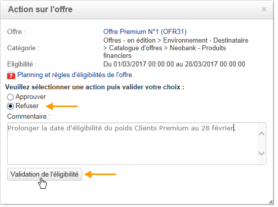Si vous souhaitez modifier les règles d'éligibilité, cliquez sur Rejeter, puis sur Validation de l'éligibilité.