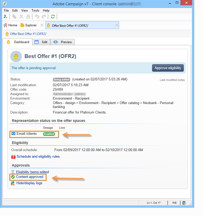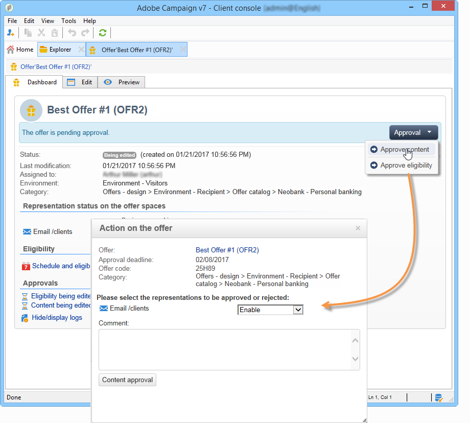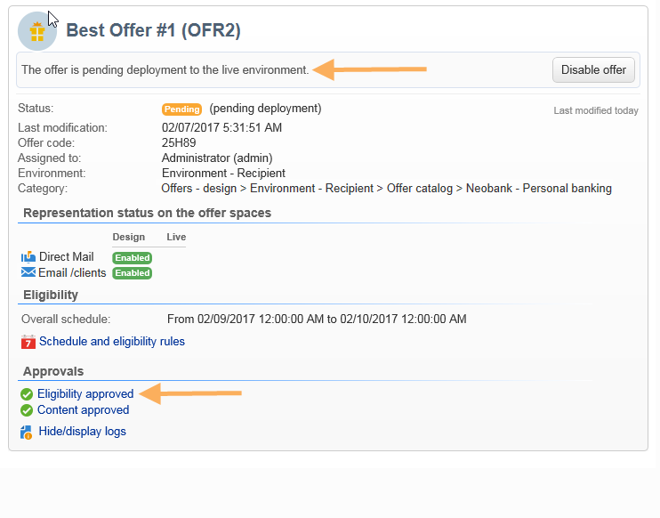 다음 Content approved 언급이 모든 오퍼 표현이 활성화 및 승인되었음을 의미하지는 않습니다. 모든 오퍼가 활성화/승인되었는지 여부에 상관없이 컨텐츠 승인 프로세스가 달성되었음을 나타냅니다.