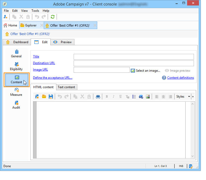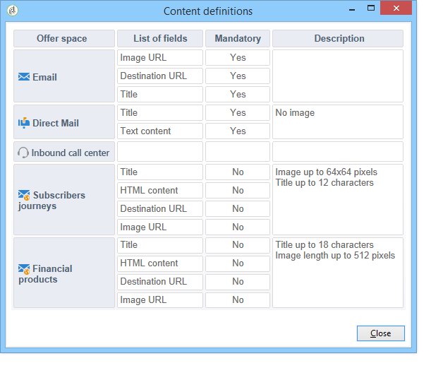 오퍼 공간 구성 중에 정의된 필수 필드를 찾으려면 Content definitions 링크를 클릭하여 목록을 표시합니다. 자세한 내용은 오퍼 공간 만들기.