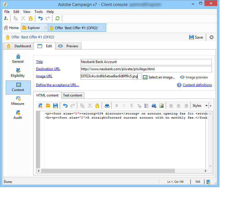 이 예에서 오퍼에는 제목, 이미지, HTML 컨텐츠 및 대상 URL이 포함되어야 합니다.