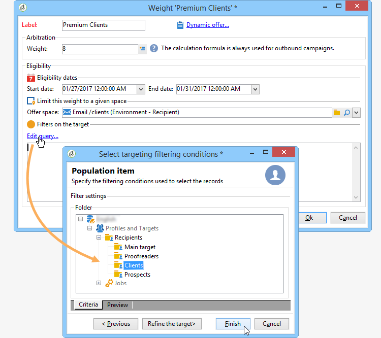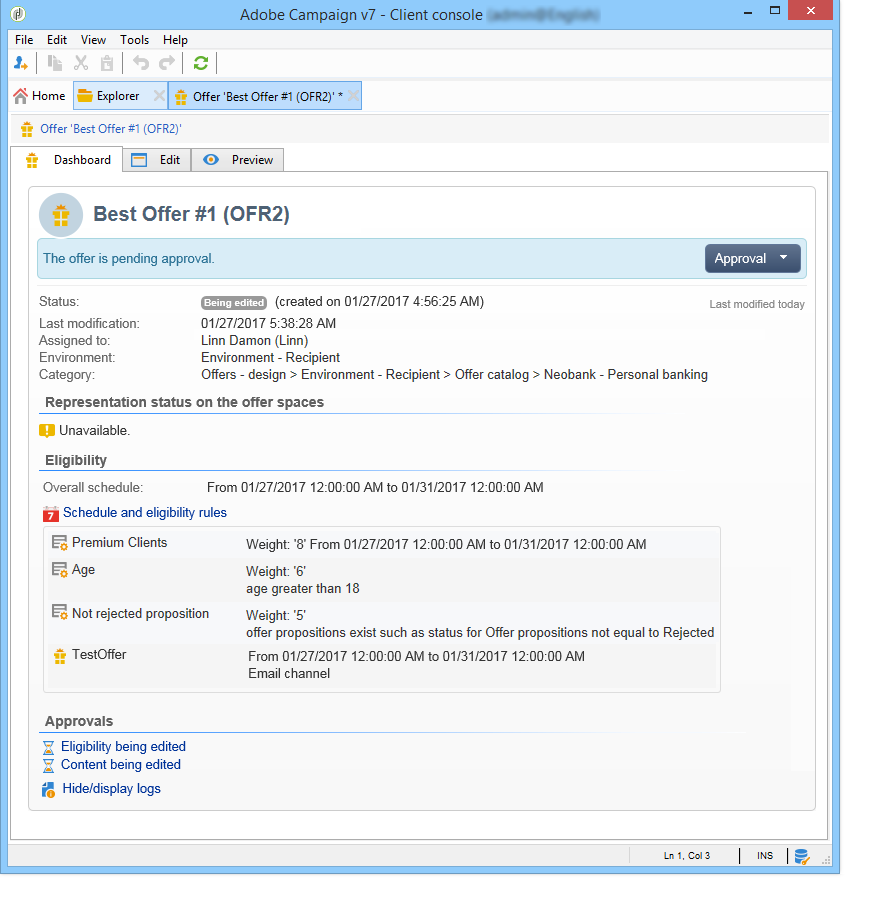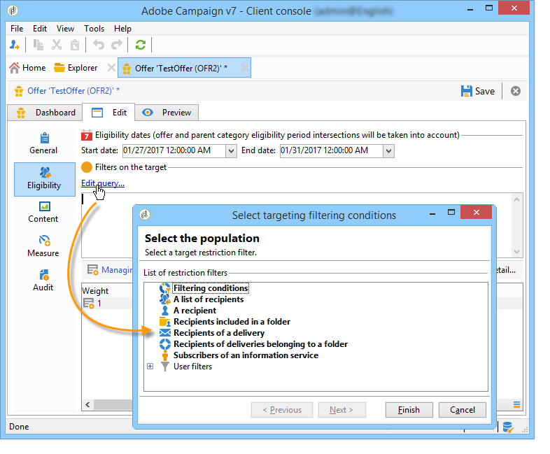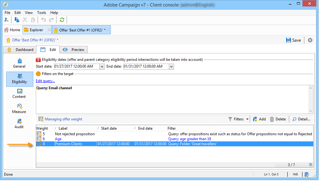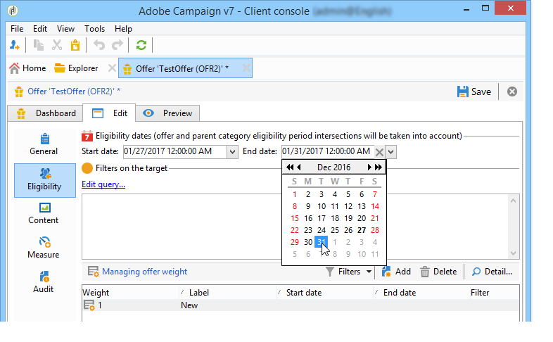 에서 Eligibility 탭에서 오퍼가 유효할 기간을 정의하고 오퍼를 표시할 수 있습니다. 타겟에 적용할 필터 및 오퍼 가중치입니다.