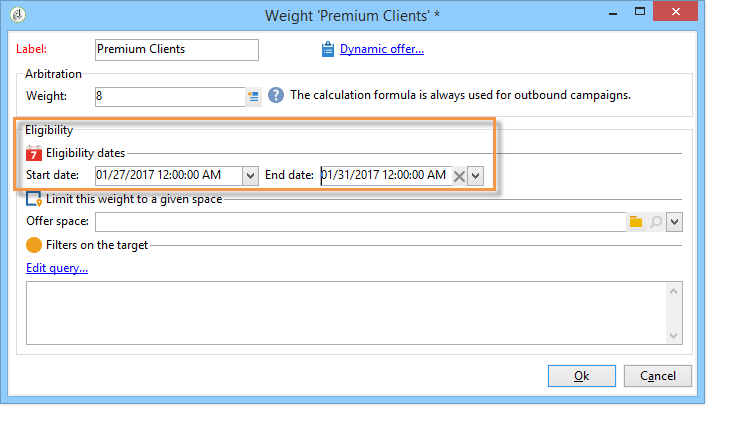 이 날짜 이외에는 상호 작용 엔진에서 오퍼를 선택하지 않습니다. 오퍼 카테고리에 대한 자격 날짜도 구성한 경우 가장 제한적인 기간이 적용됩니다.