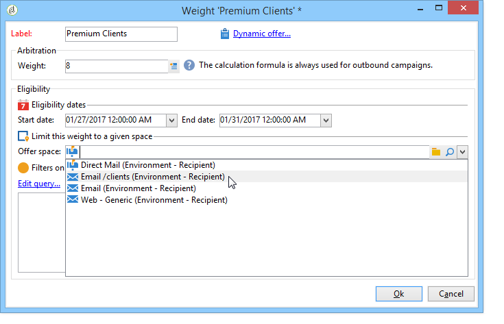 예를 들어 동일한 오퍼에 대해 여러 가중치를 구성할 수 있습니다. 예를 들어 지원 기간, 특정 타겟 또는 오퍼 공간을 구별할 수 있습니다.
