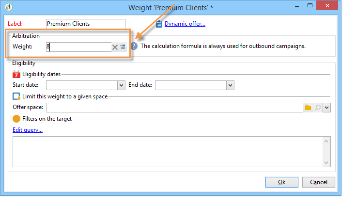 지정된 가중치는 오퍼가 속한 카테고리의 매개 변수에 따라 일시적으로 수정할 수 있습니다. 자세한 내용은 오퍼 카테고리 만들기.
