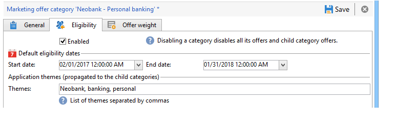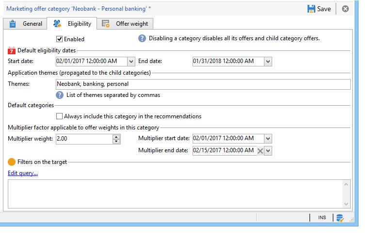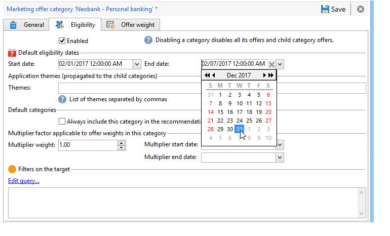 각 카테고리에 대해 자격 날짜를 정의할 수 있습니다. 즉, 카테고리에 포함된 오퍼가 더 이상 해당 대상에 표시되지 않는 기간을 넘어서면 됩니다. 특정 카테고리의 오퍼를 오퍼 엔진에서 우선순위로 선택하려는 경우 예를 들어 제품을 더 잘 노출하려면 카테고리에 곱하는 가중치를 추가하여 지정된 기간 동안의 가중치를 높일 수 있습니다.