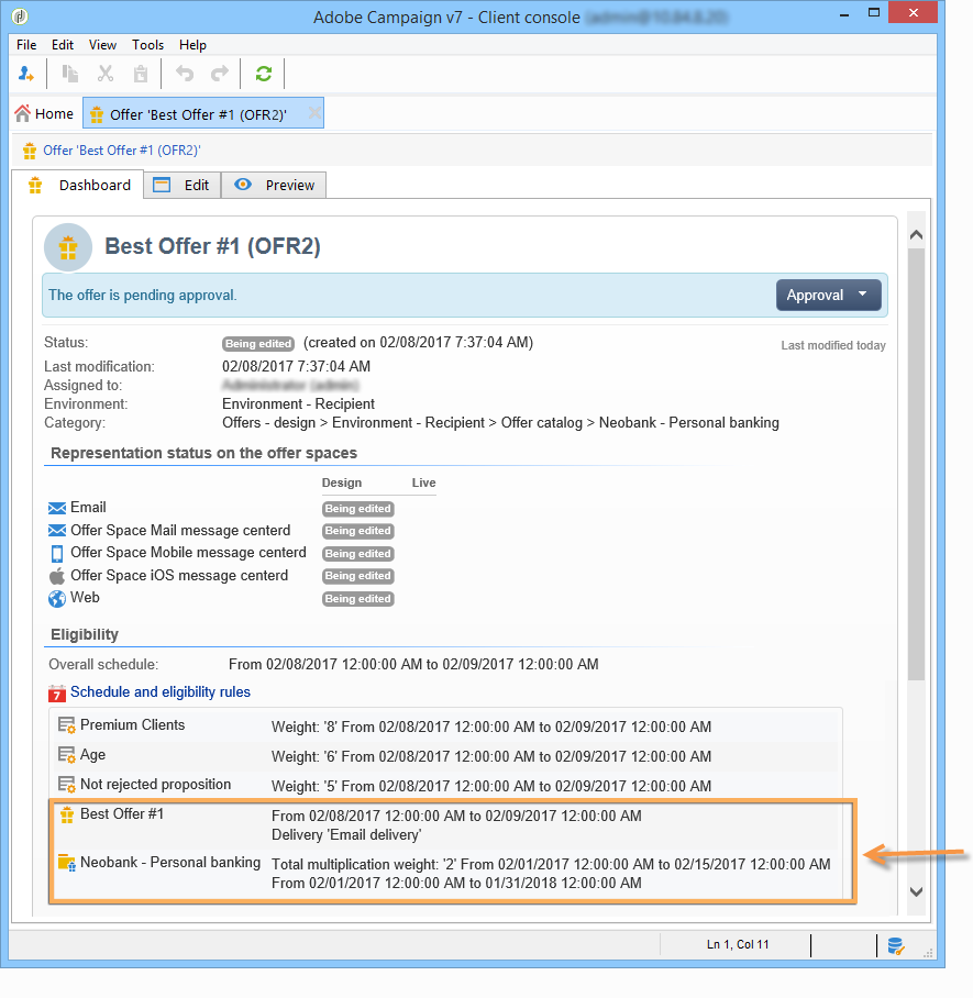자격 규칙 요약은 카테고리에 포함된 오퍼의 대시보드에서 사용할 수 있습니다. 이를 보려면 Schedule and eligibility rules of the offer 링크를 클릭합니다.