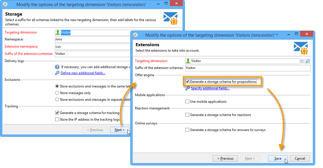 클릭 Next 마법사의 다음 화면으로 진행하려면 Generate a storage schema for propositions 상자를 클릭하고 Save.