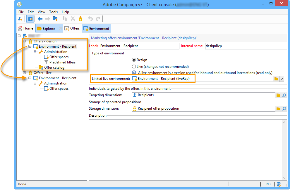 기본적으로 상호 작용은 Design 환경 및 Live 환경에 연결된 환경. 두 환경은 기본 제공 수신자 테이블을 타겟으로 미리 구성되어 있습니다.