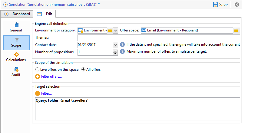 시뮬레이션을 위해 고려할 오퍼를 세분화하려면 하나 또는 여러 테마(카테고리에 미리 지정됨)를 추가할 수 있습니다.