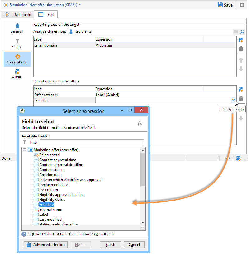 를 통해 타겟 또는 오퍼 자체에 보고 축을 추가하여 시뮬레이션 분석을 향상시킬 수 있습니다 Calculations 탭.