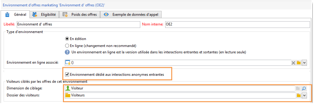 Lorsque vous créez l'environnement anonyme via l'assistant de création de mapping, la case Environnement dédié aux interactions anonymes entrantes est automatiquement cochée dans l'onglet Général de l'environnement.