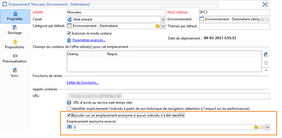 Pour cela, cochez la case Basculer sur un emplacement anonyme si aucun individu n'a été identifié, puis spécifiez l'environnement dédié à ces visiteurs non identifiés dans la zone Emplacement anonyme associé de la définition d'un emplacement.