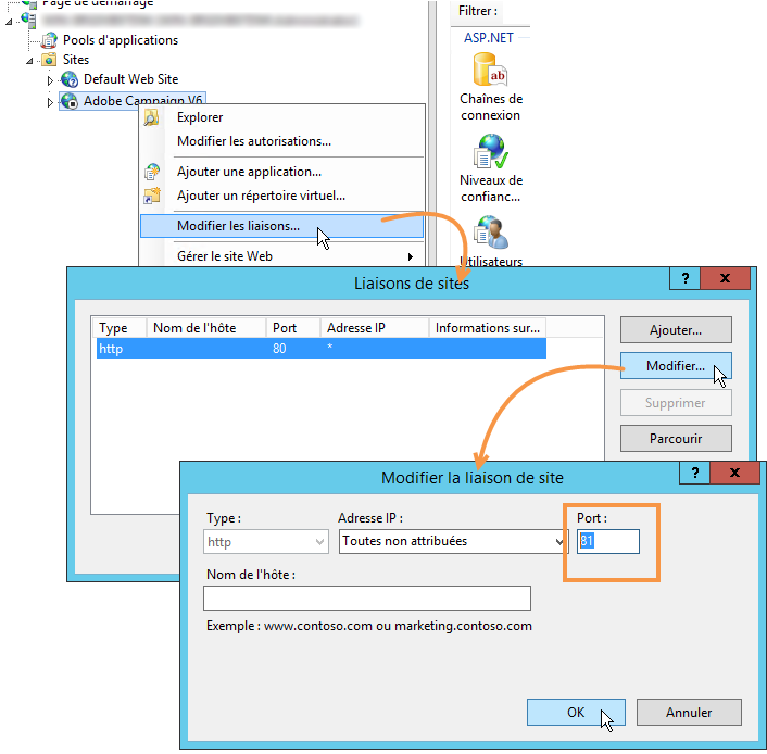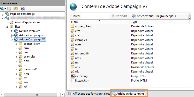 Si votre serveur IIS embarque plusieurs sites web pour Adobe Campaign configurés de manière avancée (port commun et adresses IP différentes), veuillez vous rapprocher de votre administrateur.