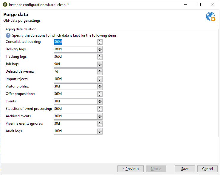 El deployment wizard, al que se accede a través del menú Tools > Advanced, le permite configurar el tiempo que se guardan los datos para. Los valores se expresan en días. Si estos valores no se modifican, el flujo de trabajo utilizará los valores predeterminados.