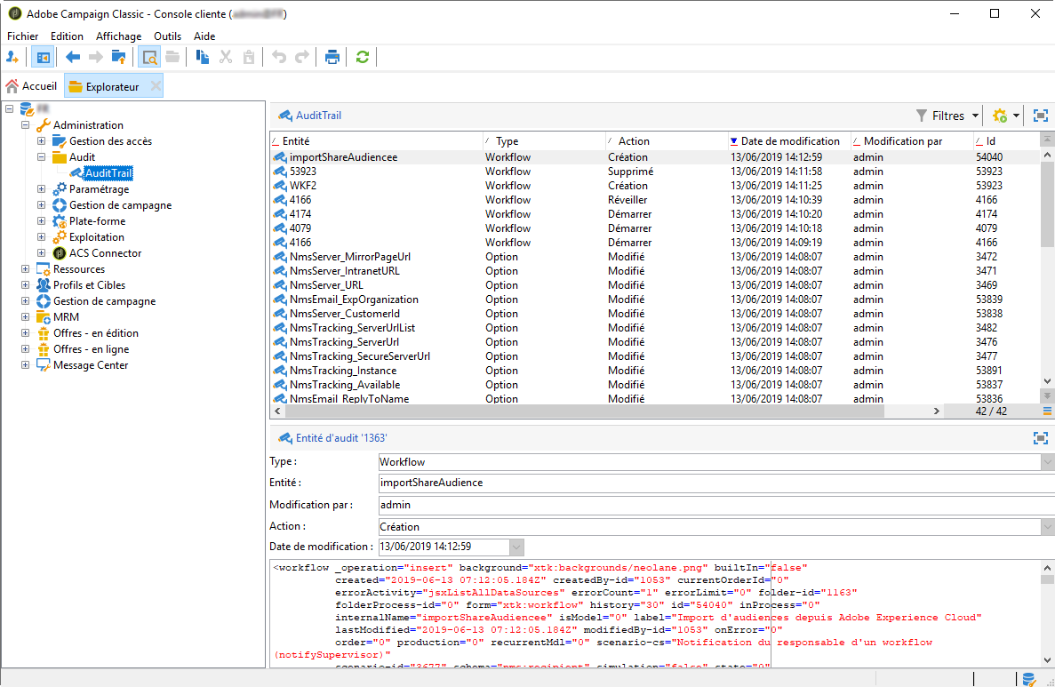Dans Adobe Campaign, le Suivi vous donne accès à l’historique complet des modifications apportées à votre instance.