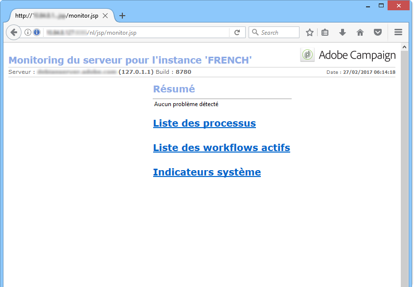 Ce jsp représente le point d'entrée des API de l'application Adobe Campaign. Il peut donc servir de monitoring fin de l'application. Il peut également être utilisé pour surveiller les services web Adobe Campaign. Il est utilisé dans nos scripts de surveillance, néanmoins, il est réservé à des utilisateurs experts.