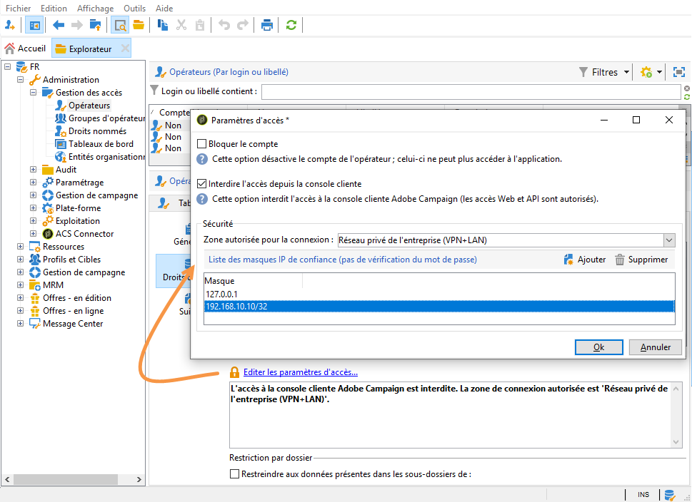 L'opérateur et son login doivent avoir été préalablement configurés dans la console cliente Adobe Campaign avec les droits et les restrictions sur les données de la base.