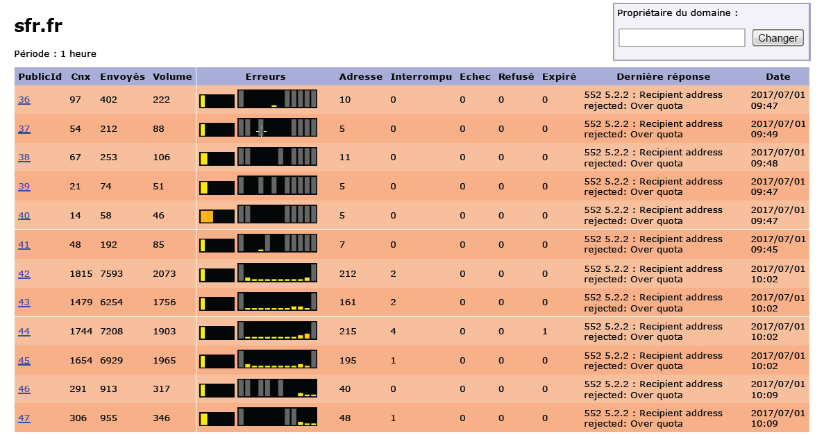 Ligne rouge : messages abandonnés par le Shaper, rendus au mta (correspond à ce qui est rejeté sur cette reprise).