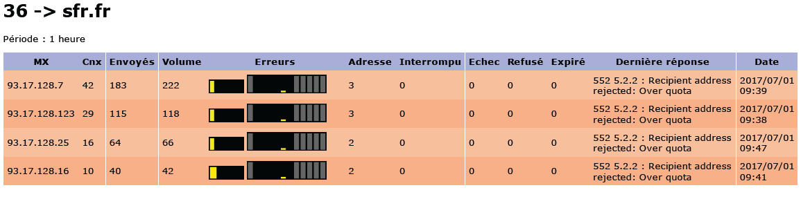 Le rapport Statistiques SMTP d'envoi permet de contrôler l'activité des serveurs. Il affiche une synthèse de chacun des mtachilds.