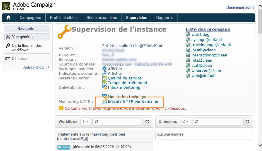 Accédez à Supervision, puis cliquez sur le lien Vue générale pour afficher la page de supervision des processus Adobe Campaign.