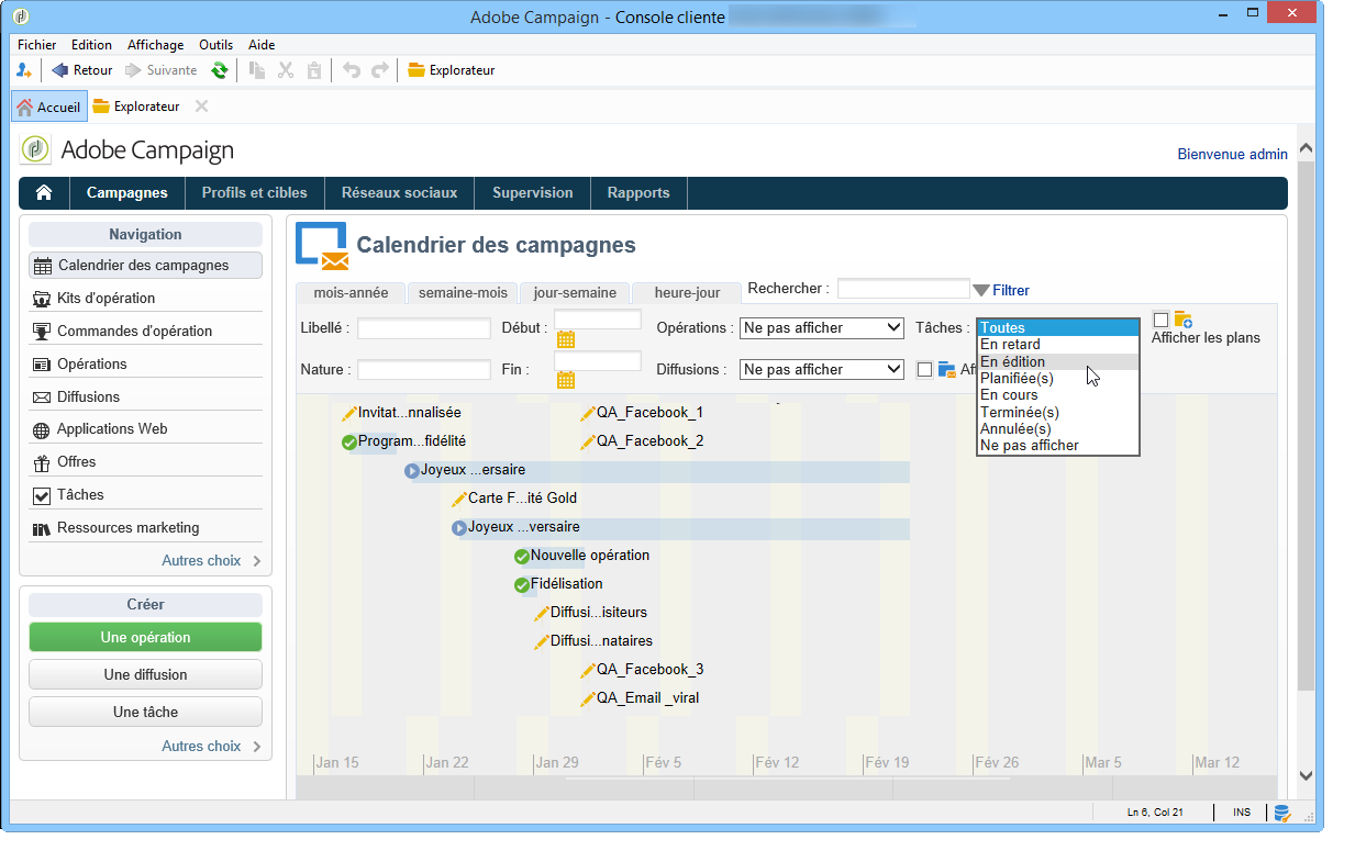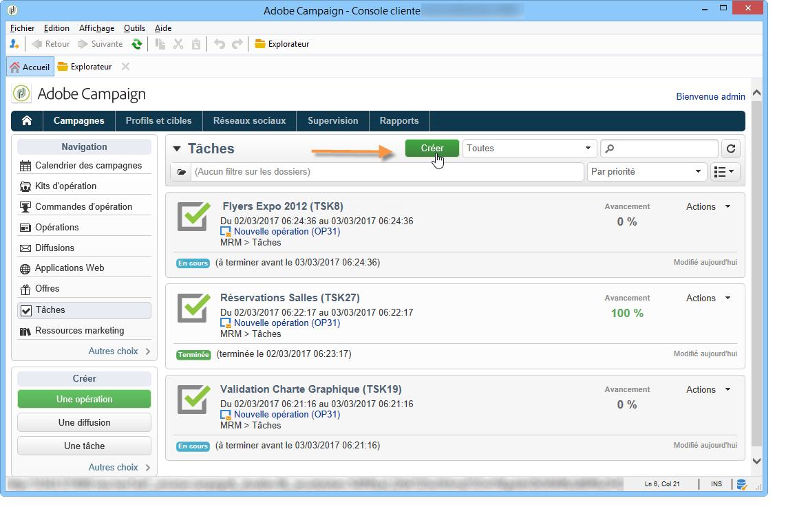Pour créer une tâche, cliquez sur le lien Tâches de l'onglet Campagnes et choisissez Créer.