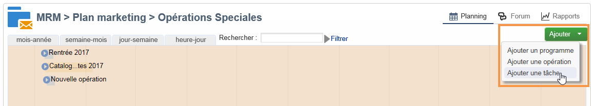 Vous pouvez créer des tâches directement au niveau d'un programme pour gérer les actions qui relèvent de l'organisation globale de celui-ci et non d'une opération particulière (par exemple, une réunion pour discuter du thème des prochaines opérations au sein du programme). La tâche apparaîtra dans le planning du programme.
