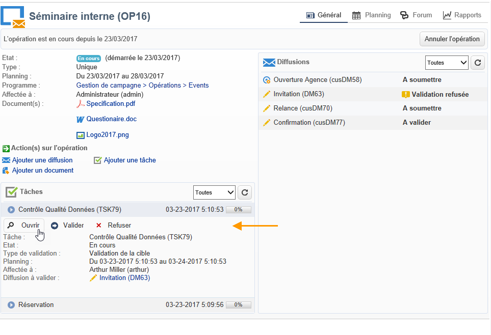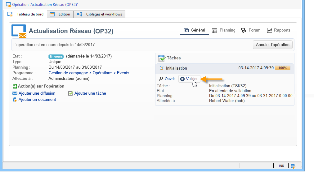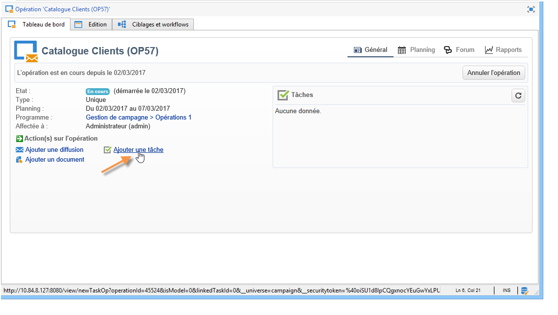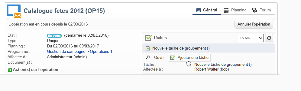 Une fois créée, la tâche est ajoutée dans le tableau de bord de l'opération.