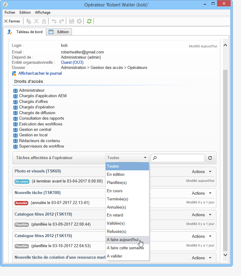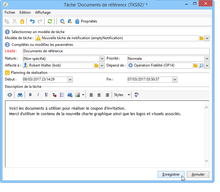 Affecté à : l'opérateur ou le groupe d'opérateurs à qui l'email va être envoyé. Si vous réaffectez la tâche une fois l'email envoyé, l'email ne sera pas renvoyé au nouvel opérateur affecté à la tâche (pour cela, il faut réinitialiser la tâche et changer sa date de début).