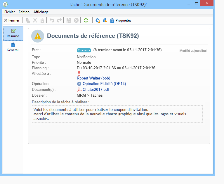 Les documents référencés apparaîtront dans les notifications envoyées aux différents opérateurs impliqués dans la tâche, ainsi que dans le tableau de bord de la tâche.