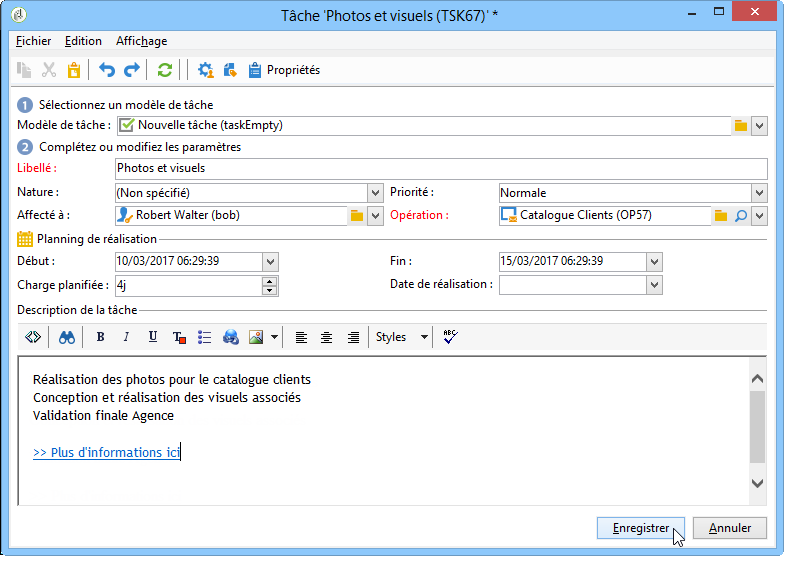 Saisissez au minimum le nom de la tâche et sélectionnez l'opération à laquelle elle est rattachée. Vous devez également indiquer les dates de début et de fin. Ces trois informations sont obligatoires.