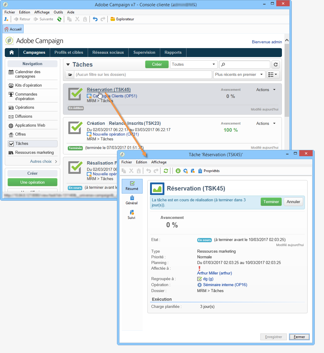 Les tâches peuvent être créées, visualisées et suivies au niveau de liste des tâches et du tableau de bord d'une opération. Elles peuvent également être visualisées et suivies au niveau des plannings du plan marketing, des programmes et des opérations.