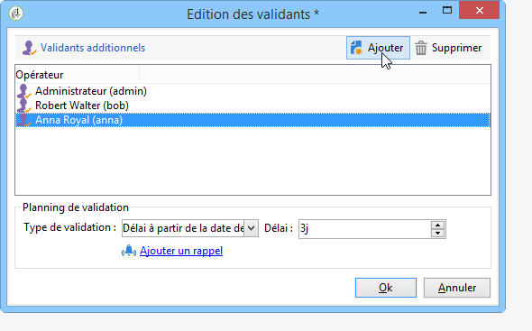 Pour désigner une liste d'opérateurs, cliquez sur le lien Editer… situé à droite du champ désignant le premier validant et ajoutez autant d'opérateurs additionnels que nécessaire, comme dans l'exemple ci-dessous :