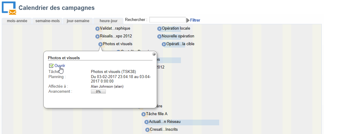 Une fois créée, la tâche est ajoutée dans le calendrier des campagnes et dans la liste des tâches. Pour éditer une tâche, sélectionnez-la dans le planning, ou cliquez sur son nom dans la vue d'ensemble des tâches, et cliquez sur le lien Ouvrir.