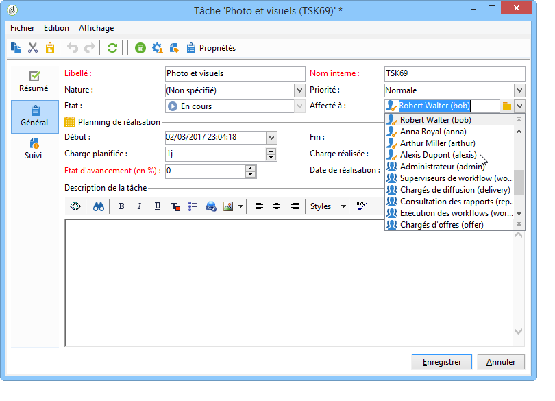 Le responsable crée la tâche et renseigne les différents champs. Pour plus d'informations, consultez la section Créer une nouvelle tâche.